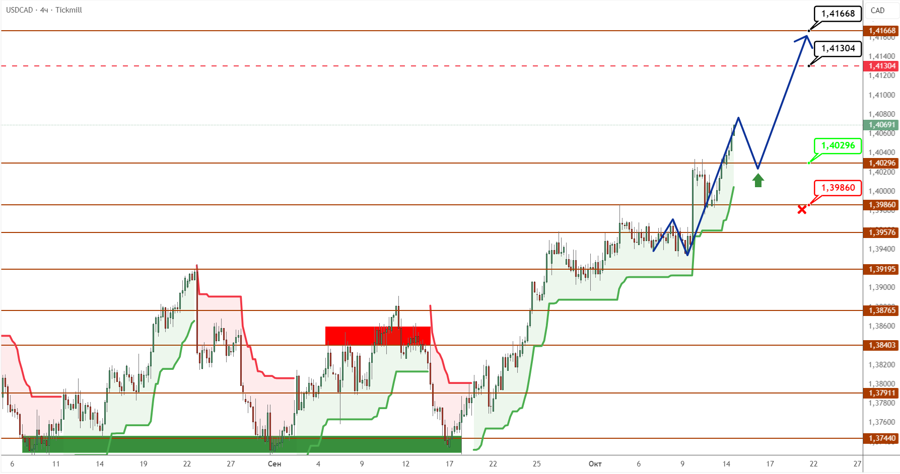 Это указывает на высокую вероятность продолжения восходящего вектора в паре в этом периоде. Цена пробилась за уровень 1,4029, выступавший серьезным барьером, и теперь должна закрепиться над ним для продолжения роста. Для этого вероятно понадобится локальная коррекция с возвратом в район уровня 1,4029 для набора объема, где ожидается граница основной зоны поддержки с высоким покупательским интересом. Ретест этой зоны с последующим отскоком даст возможность развить очередную восходящую волну, которая нацелится в область между 1,4130-1,4166.